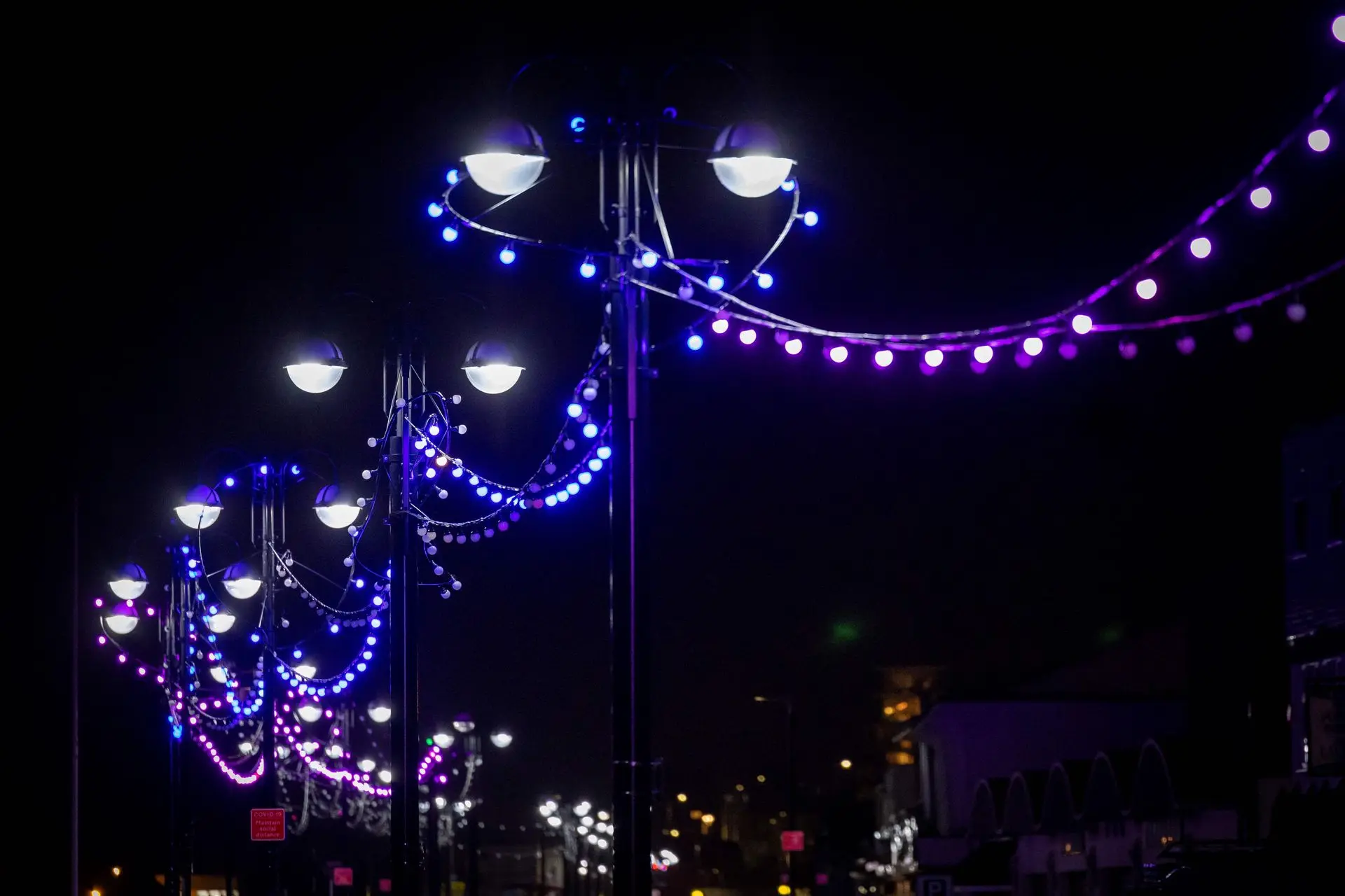 Unveiled in March 2022, the new public artwork along the North Promenade in Cleethorpes is a 500 m long animated light display. It was designed by award-winning British visual artist Esther Rolinson, working in close collaboration with architectural lighting specialists The Light Lab. Luminations was developed from Esther’s ‘Gravitate’ series of drawings and comprises two swooping lines of lights that weave in and out of each other. Suspended from the lamp posts along the promenade, the lights flow back and forth along the artwork, performing loops through custom built fixtures.