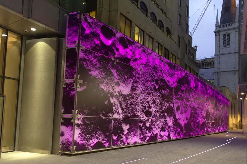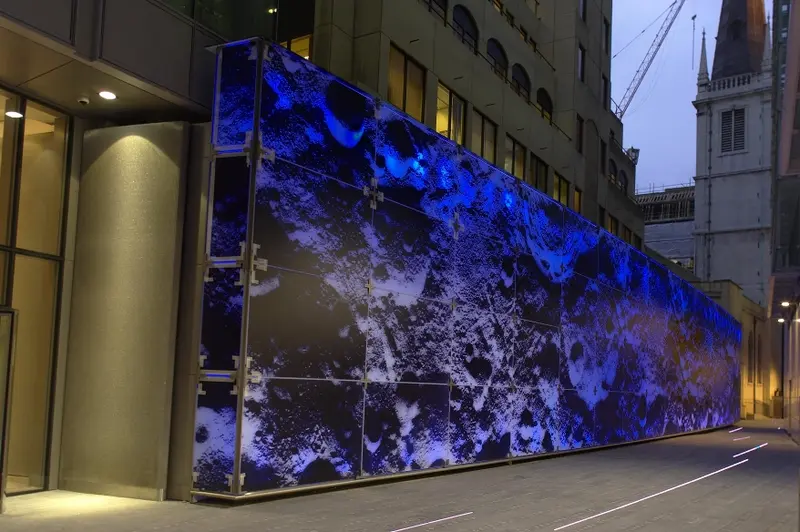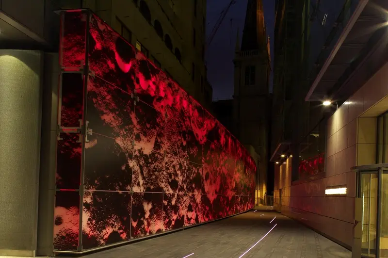 The Moonscape forms part of an artwork called ‘Time and Tide’ created by Simon Patterson and Arup. Time is represented by a series of textual lists embedded into the pavement which chart events, people, places, and institutions related to the City’s past and present. The Moonscape represents the Tide element, with the colour of the backlit glass panels changing slowly over time to create a dramatic effect.