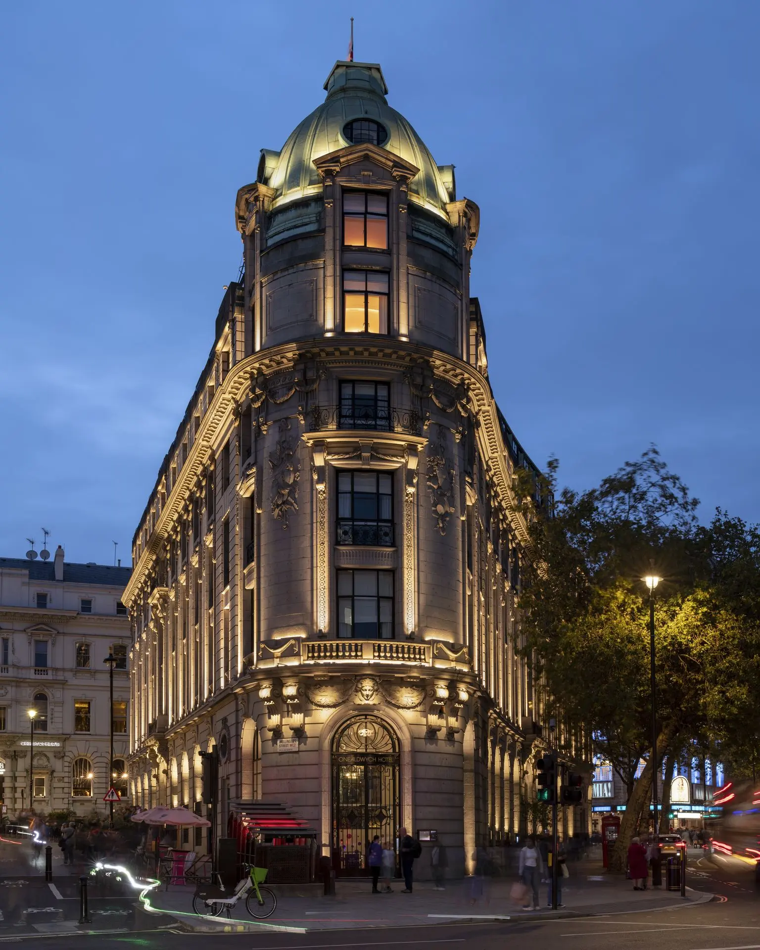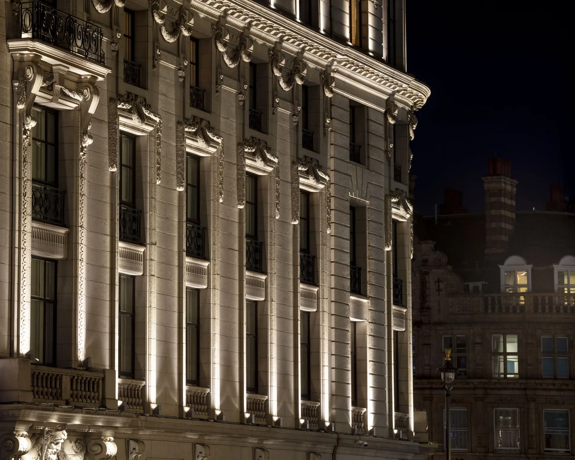Rising to this double challenge, lighting designers StudioFractal created a carefully modulated lighting scheme for the hotel’s façades. Following their ethos of using as little light as necessary, StudioFractal created a design that used controlled illumination from low profile lighting equipment to complement and enhance the rhythm and rich detailing of the building. Lighting trials were carried out to confirm the exact placement of fixtures and to get the right optical properties and warm colour temperature needed to create a dramatic, yet elegant presence that adds to London’s ever changing night-time experience.